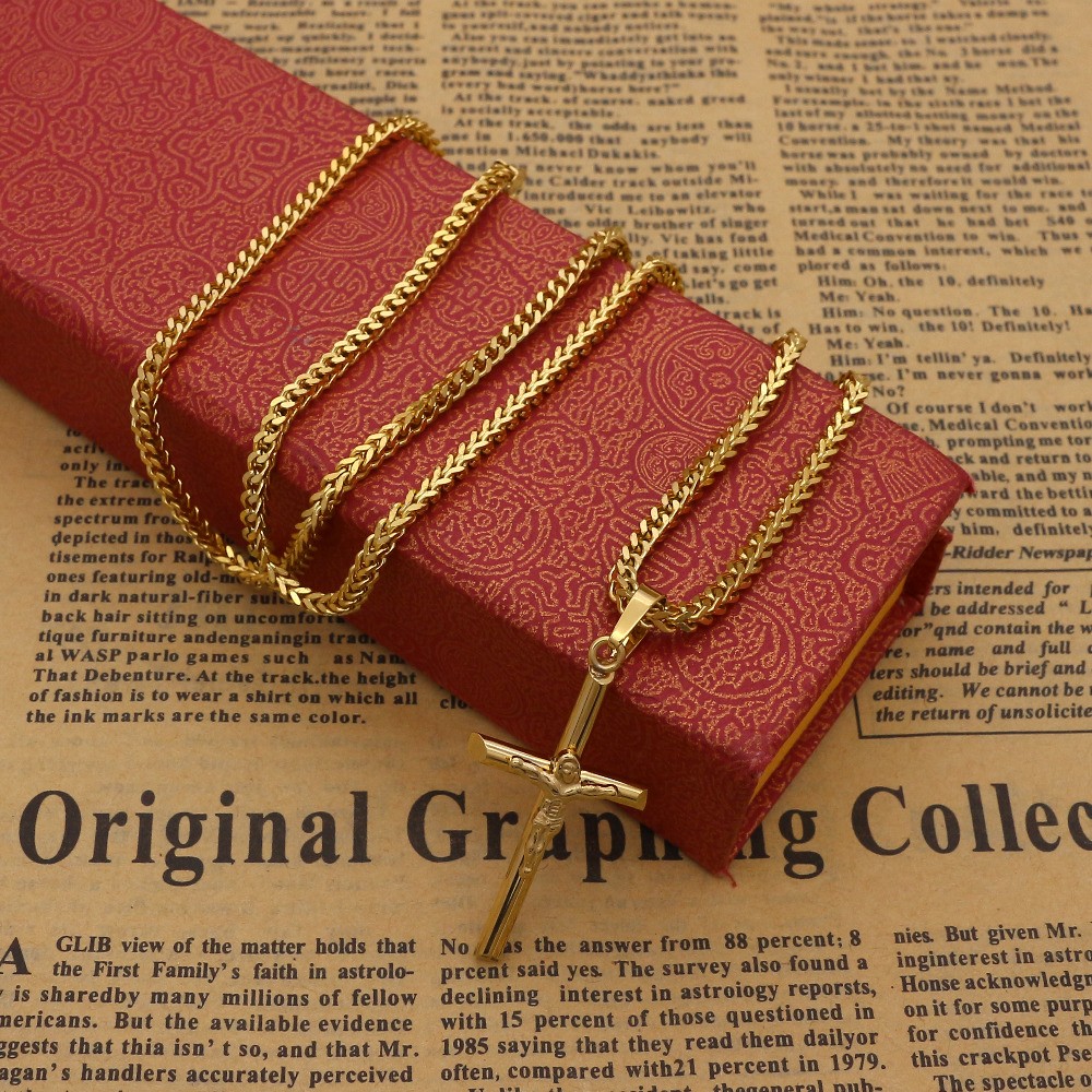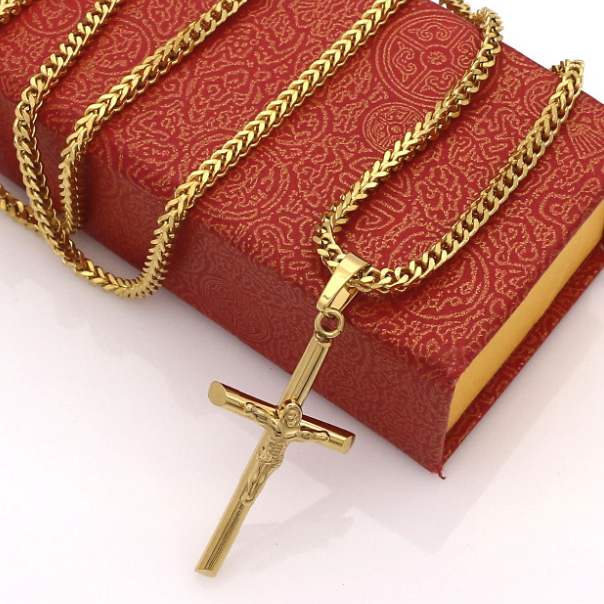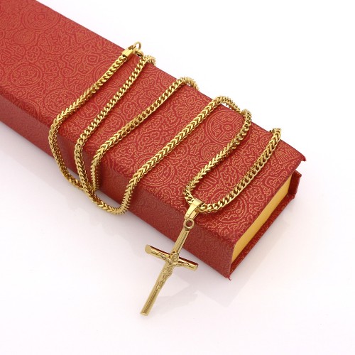 Magnifique collier avec chaine de 60cm et croix religieuse en acier inoxydable couleur or.