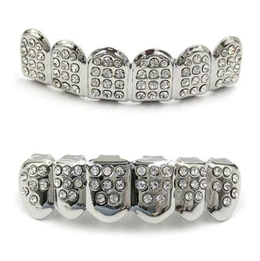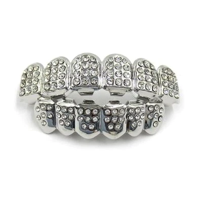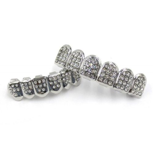 Grillz (ou dentier) dents du haut et du bas couleur argenté pour avoir les même dents que ton rappeur US préféré. C'est beau, ça brille, et c'est moins cher que le dentiste. Instructions pour les poser fournies avec.