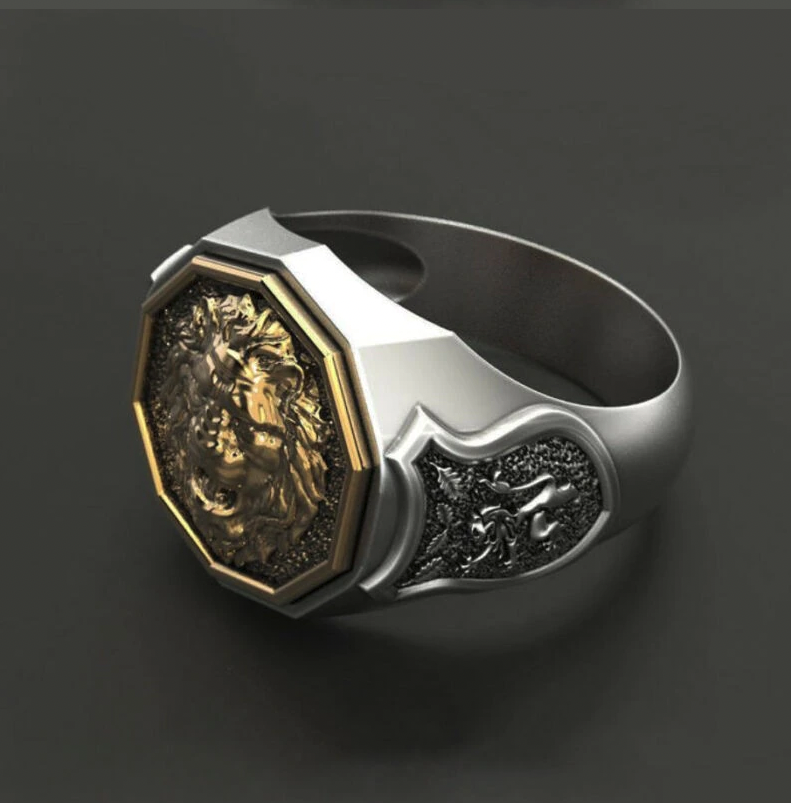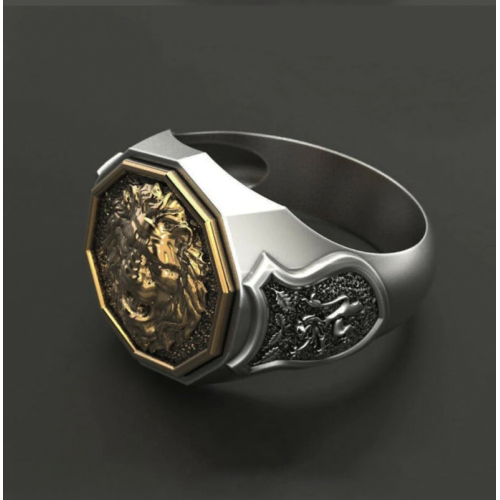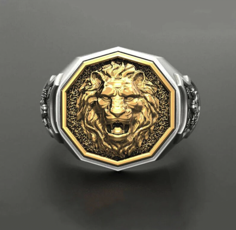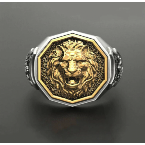Bague "Lion" couleur argent et or en acier inoxydable disponible en taille 12 et 13.